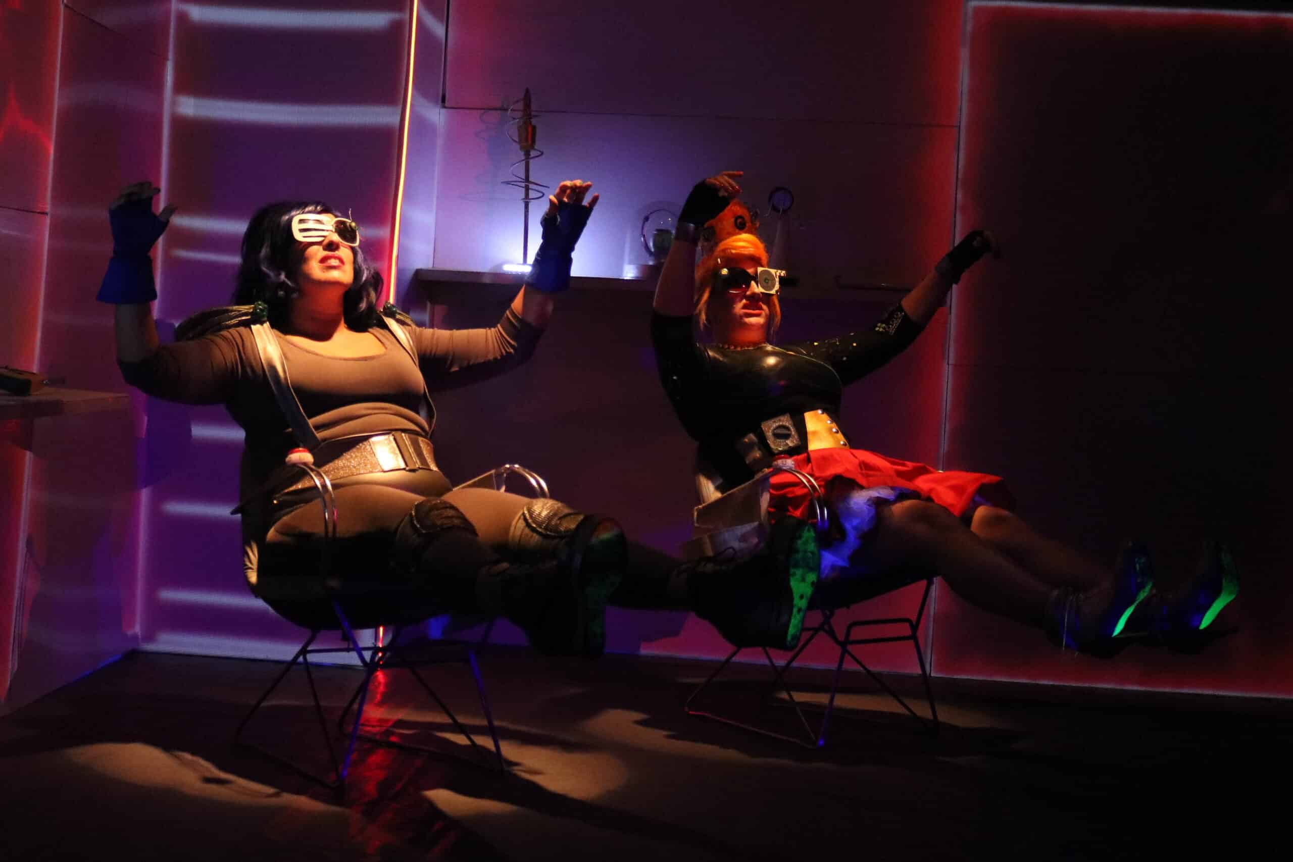 El proceso creativo de «Un punto azul pálido en la oscuridad. Una distopía cercana» comenzó con el deseo de las actrices Nadia Budini, Mercedes Coutsiers y Priscila Sansica de montar una obra juntas, ya que venían trabajando en obras anteriores. Convocaron a Ariel Dávila para que dirigiera y escribiera a partir de temas que tenían ganas de desarrollar, entre ellos la cuestión de género. Por otro lado, Ariel venía cursando una maestría en Tecnología, Cultura y Política y de allí surgió la idea de hacer una obra de ciencia ficción. «Fuimos colectivamente creando los personajes: una pareja de mujeres viven encerradas por el cambio climático y deciden tener una hija, la cual pueden diseñar genéticamente. Y fuimos ensayando y discutiendo temas mientras avanzábamos en la historia y el guión escénico. Desarrollamos la estética de la obra que iba a ser retrofuturista y convocamos al resto del equipo que trabajó junto a nosotras para que la puesta, que es compleja, y las actuaciones estuvieran en el mismo nivel», explica el equipo creativo. «Estrenamos en el 2021 todavía saliendo de la pandemia, no imaginamos cuando comenzamos a crear la obra que estaríamos encerrados por una cuarentena como en la ficción de la obra, que la inteligencia artificial no sería más algo del futuro sino un debate cotidiano».