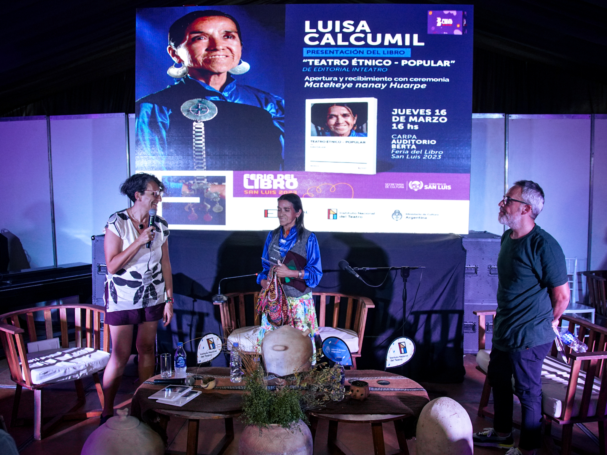 En la carpa Auditorio Berta de la Feria del libro de San Luis 2023, y tras una apertura con recibimiento con ceremonia Matekeye nanay Huarpe, la editorial del Instituto Nacional del Teatro presentó el libro “Teatro étnico-popular” de Luisa Calcumil, volumen que integra la colección «Homenajes».
